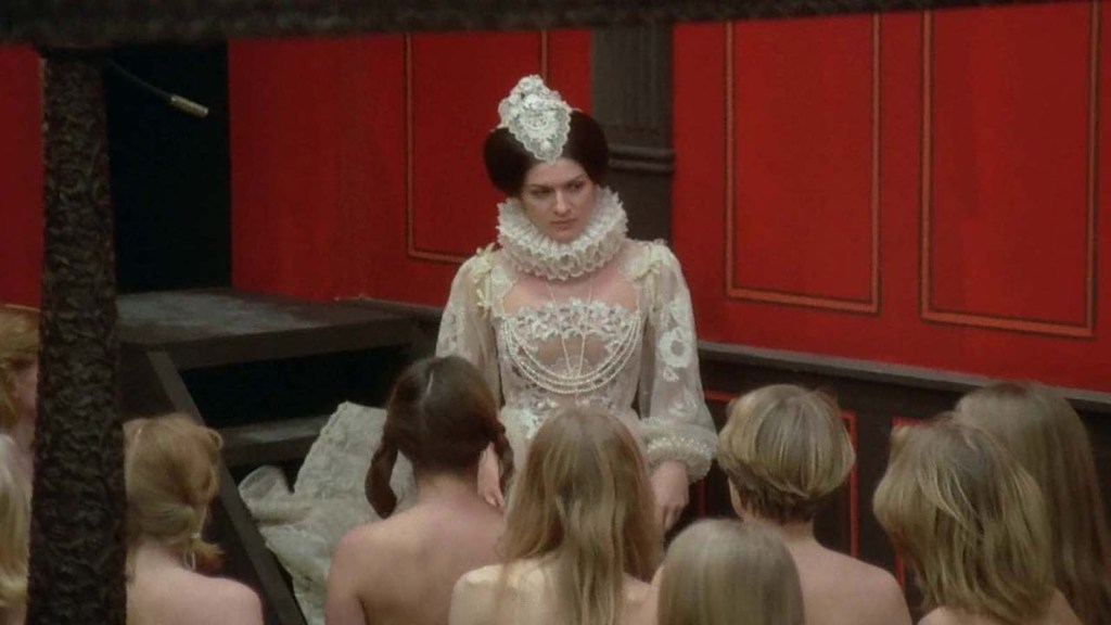 ERZSEBET BATHORY, INTERPRETADA POR PALOMA PICASSO, HIJA DE PABLO RUIZ-PICASSO Y LA ESCRITORA FRANÇOISE GILOT, EN LA PELÍCULA CUENTOS INMORALES (1973) ELIGIENDO ENTRE HERMOSAS JOVENCITAS A QUIENES CONTRIBUIRÍAN CON SU SANGRE A SU BAÑO REJUVENECEDOR.